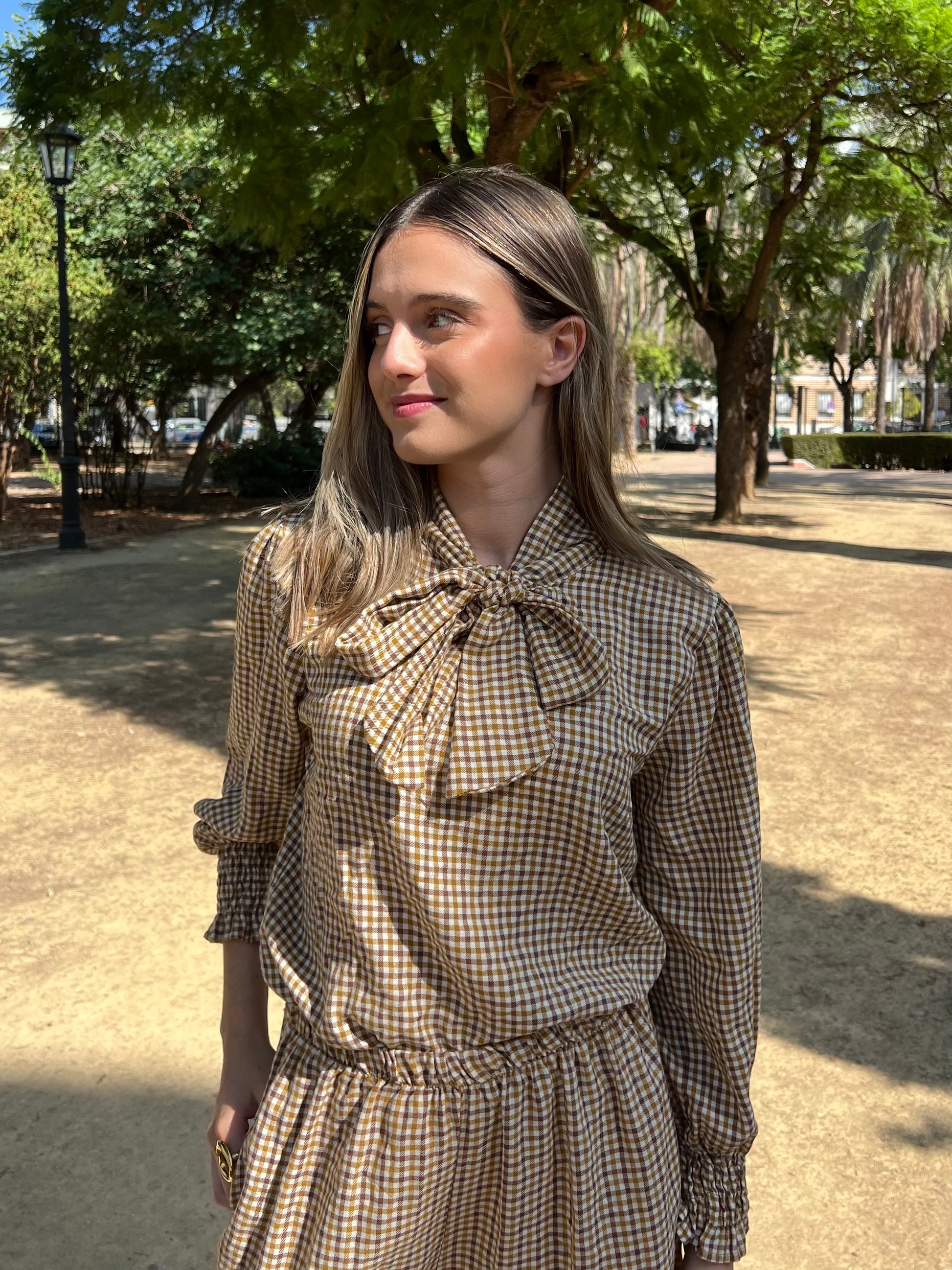 Blusa lazada cuadro vichy mostaza