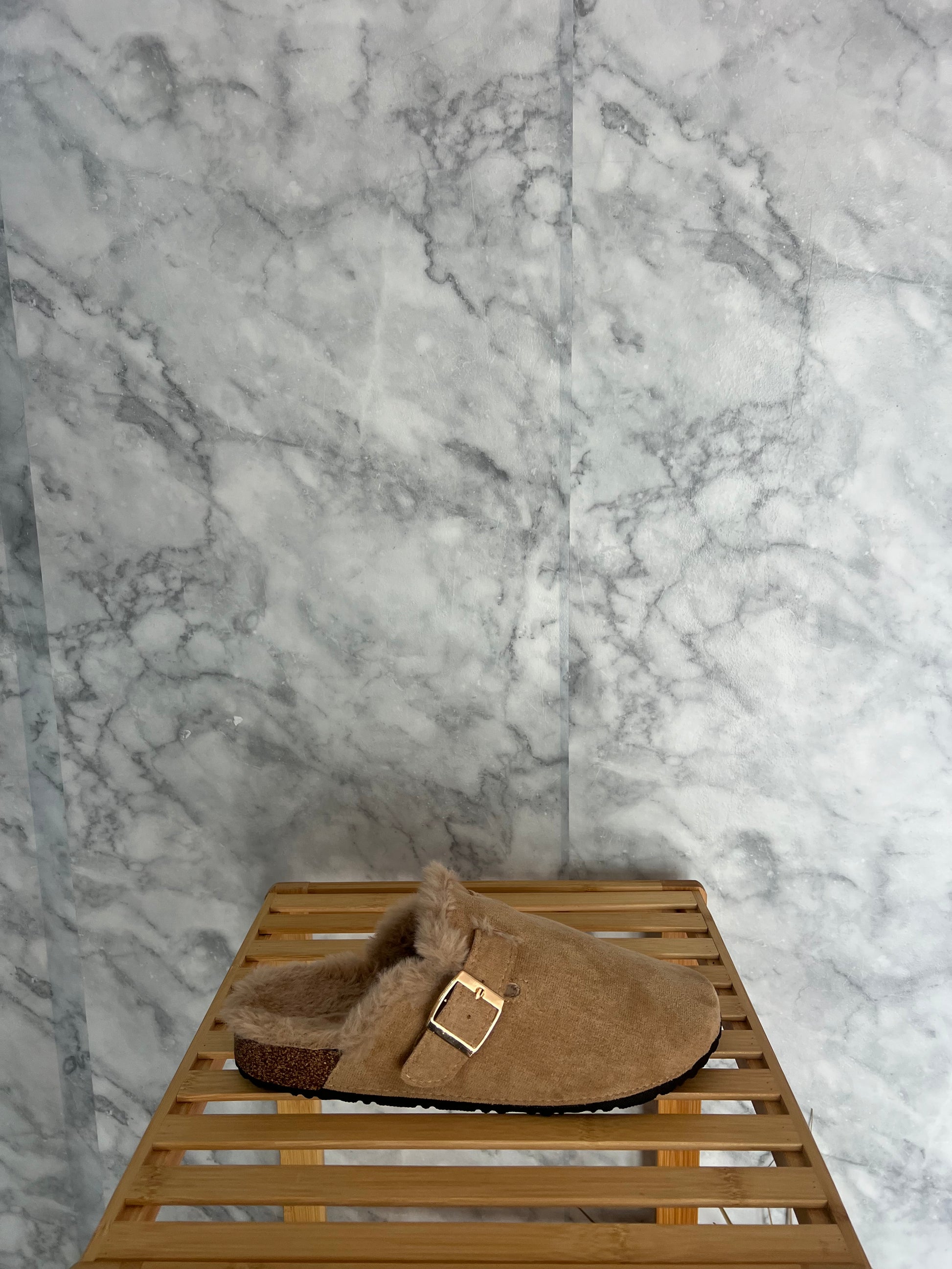 Zuecos hebilla con pelo beige